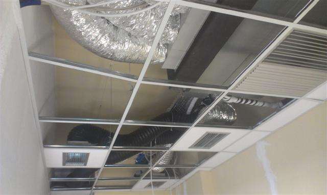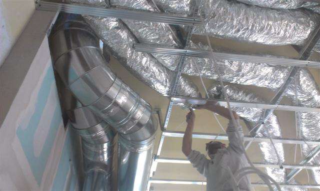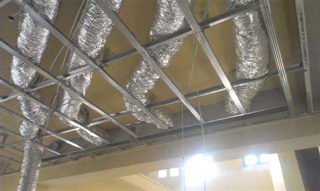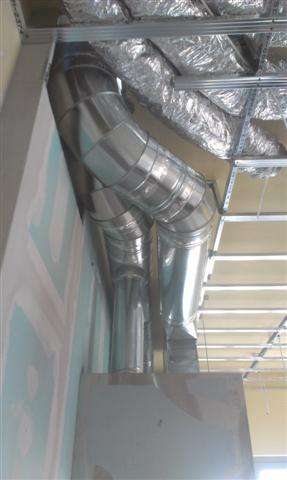 Παραθέτουμε δείγμα φωτογραφιών από εφαρμογή δικτύου κλιματισμού εξαερισμού σε εστιατόριο στην παλιά πόλη. Χρησιμοποιήθηκαν εύκαμπτοι μονωμένοι οδευτές με κουτιά στομίων για τον κλιματισμό και στρογγυλής διατομής αγωγοί για την χοάνη απαγωγής καυσαερίων.